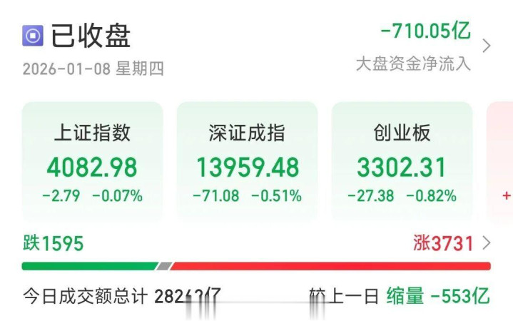 中国商报(记者马文博)1月8日,A股窄幅震荡。截至收盘,沪指跌0.07%,深成指跌0.51%,创业板指跌0.82%,北证50指数涨0.81%。沪深京三市成交28262亿元,较上一日缩量553亿元,超3700只个股飘红。